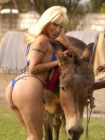 Set de fotos con la bella vedette peruana Maribel Velarde con bikini azul y de yapa posando con un burro